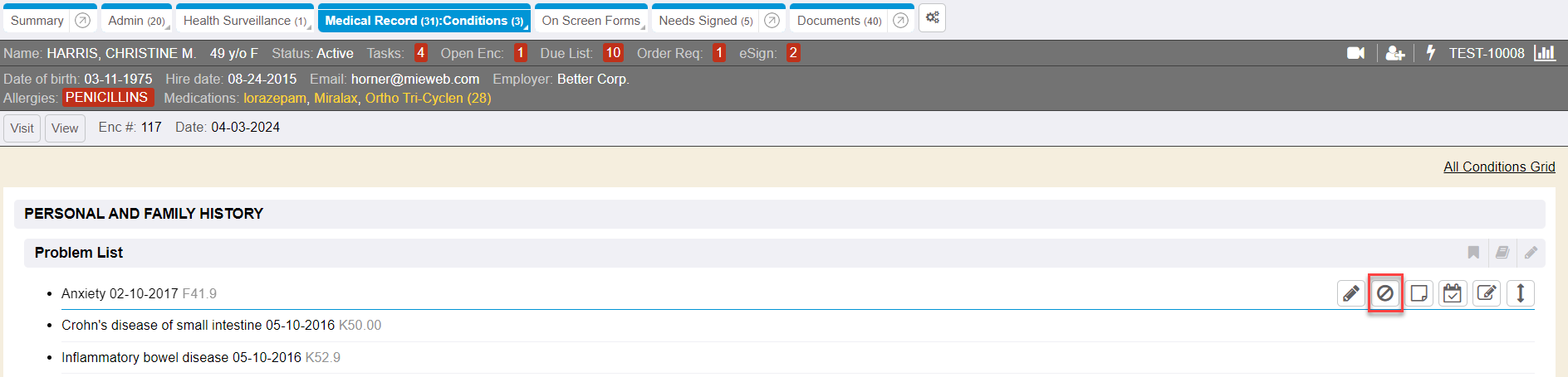 - Problem List are patient conditions that are set to ‘Yes’ by the radio button when adding the condition. If the Clinical Status is set to Inactive, it will display next to the condition.