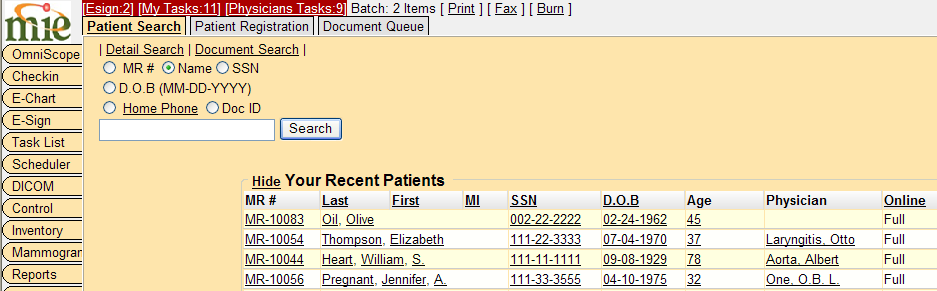 - Under the E-Chart tab, enter “Oil” in the search box to find test patient like Olive Oil or Mickey Mouse, etc.
