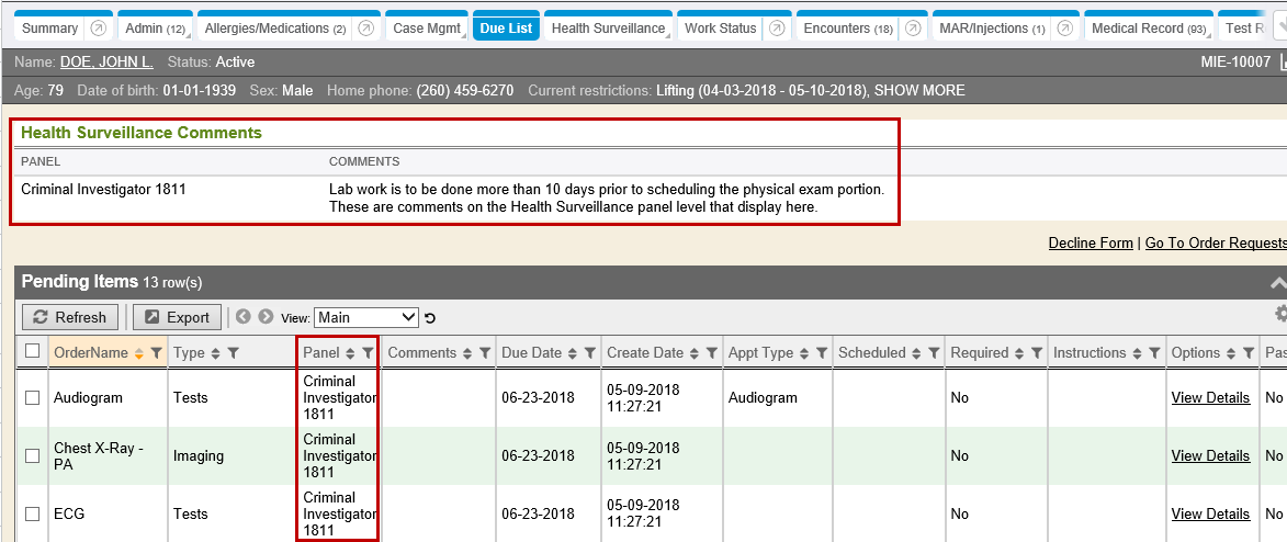 If a Health Surveillance Panel, the chart is a member of, has any comments (on the panel level), those will display in the Health Surveillance Comments section of the Due List chart tab at the top. These are panel level comments. These comments pertain display if the chart is a member of that corresponding health surveillance panel that pending due list items are related to. Superusers can update Health Surveillance Panel comments by going to Health Surveillance tab, editing the panel and updating the comments field on the specific Health Surveillance Panel level.
