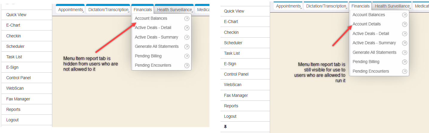 Thus, the menu item tab can be restricted, instead of the actual system report itself.