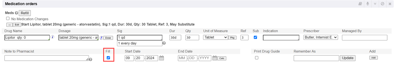 From an encounter, the prescriber would be prescribing the medication in the Meds Plan section of the encounter and to signify an in-house Fill Request for the medication to be dispensed and filled from inventory, the prescriber needs to checkmark the Fill checkbox.